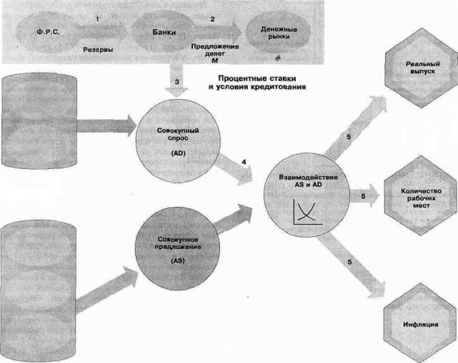 На этой диаграмме графически представлены мероприятия, посредством которых ФРС воздействует на экономическую активность. Под цифрой (1) обозначено изменение нормы обязательных резервов, которое приводит к (2) изменению М; оно вызывает (3) изменение процентных ставок и условий кредитования. В (4) происходит изменение AD в ответ на изменения инвестиций и других расходов, чувствительных к ставке процента. В (5) следуют изменения объема производства (выпуска), занятости и инфляции.