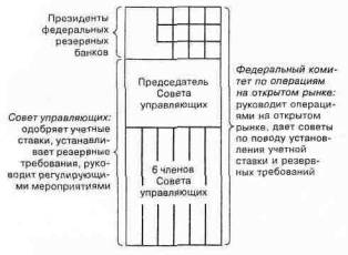 Властные полномочия внутри Федеральной резервной системы сосредоточены в двух органах. Совет управляющих, состоящий из семи членов, одобряет изменения в учетных ставках и устанавливает резервные требования. ФКООР регулирует банковские резервы. Председатель Совета управляющих возглавляет оба органа власти.