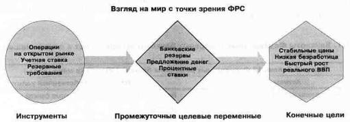Рис. 27-3. В то время как ФРС, в конечном счете, преследует такие цели, как стабильность цен, ее краткосрочные операции направлены на промежуточные целевые переменные