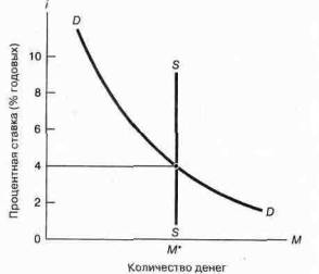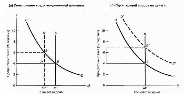 в) На рынке денег уменьшение денежной массы приводит к сдвигу (влево) линии предложения денег вдоль неизменной кривой спроса на деньги, что порождает рост процентных ставок, а также ограничение объема, условий кредитования и, следовательно, удорожание денег. .