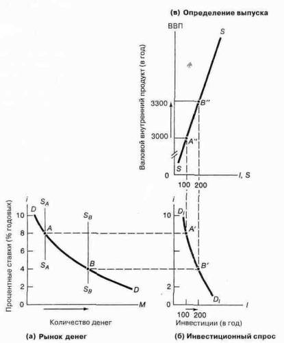Что же произошло? Увеличение денежной массы от sа до sb понизило процентную ставку от А до В; это вызвало рост уровня инвестиций от А' до В'; а последнее событие, в свою очередь, привело, через механизм мультипликатора, к расширению объема ВВП отА"доВ".