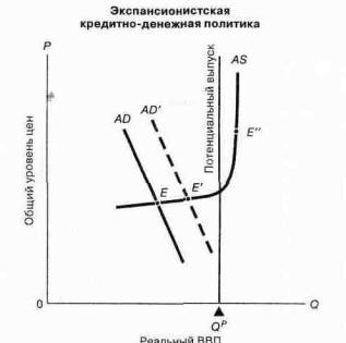 сдвиг кривой AD, изображенный на рис. 27-7. Этот сдвиг отражает денежную экспансию при наличии неиспользуемых ресурсов, т.е. при относительно пологой кривой AS. В данном случае увеличение предложения денег сдвигает кривую совокупного спроса с AD до AD', а общее макроэкономическое равновесие изменяется с Е до Е'. Данный пример демонстрирует, как экспансионистская кредитно-денежная политика может увеличить совокупный спроси оказать мощное воздействие на реальный выпуск.
