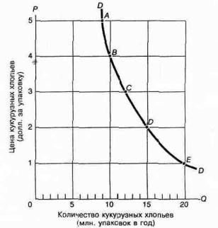 На графике кривой спроса для кукурузных хлопьев цены отложены по вертикальной оси, а величина спроса —по горизонтальной. Каждая пара (Р, Q) цифр из табл. 3-1 перенесена на график, и построена плавная кривая, проходящая через эти точки и являющаяся кривой спроса DD. Отрицательный наклон кривой спроса иллюстрирует соответствующий закон
