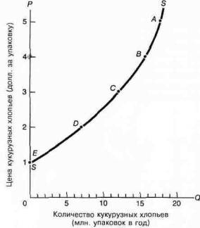 Табл. 3-3 иллюстрирует гипотетическую шкалу предложения для кукурузных хлопьев, а рис. 3-3 представляет данные из таблицы в виде кривой предложения. Эти данные говорят о том, что при цене в 1 долл. за упаковку кукурузных хлопьев, их не будет произведено совсем. По такой низкой цене производители продуктов для завтрака из злаковых, вероятно, захотят