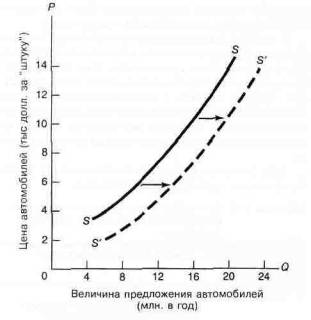 Предложение автомобилей возрастает с уменьшением затрат или увеличением конкуренции со стороны Японии. По каждой цене внутренние и иностранные производители будут поставлять больше автомобилей, и, поэтому, кривая предложения сдвинется вправо. (Что произойдет, если Конгресс ограничит квоту на импорт машин?)