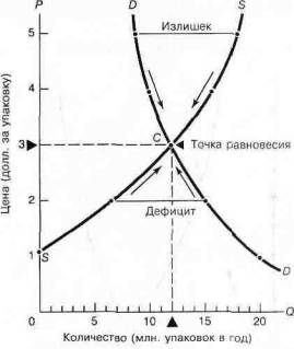 Только при равновесной цене в 3 долл. за упаковку величина предложения будет равна величине спроса. При слишком низкой цене будет иметь место дефицит товара и его цена будет расти, при слишком высокой цене —излишек (избыток), который будет снижать цену товара. '