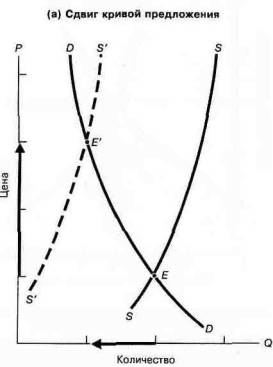 (а) Если кривая предложения сдвинулась влево, то при изначальной цене образуется дефицит. Цена будет расти до тех пор, пока величина спроса и величина предложения не достигнут нового равновесия в точке Е'.