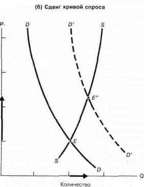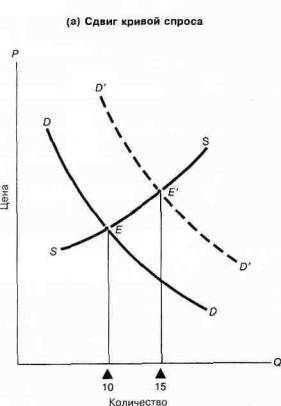 Первоначальное равновесие показано точкой Е, и исходный объем равен 10 единицам. На рис. (а) возрастание спроса (например, сдвиг кривой спроса) приводит к появлению нового равновесия в точке Е' при 15 единицах. На рис. (б) сдвиг кривой предложения приводит к движению вдоль кривой спроса от Е до Е"