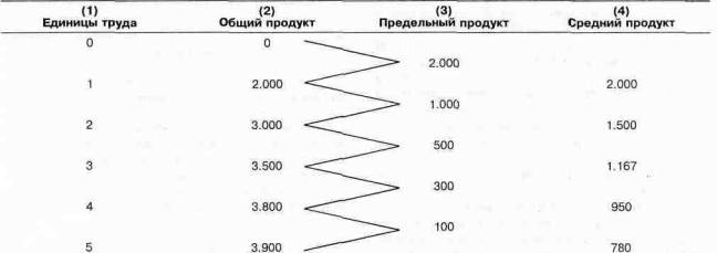 Предположим, например, что количество земли, оборудования и всех остальных ресурсов постоянно. Тогда предельным продуктом труда будет прирост выпуска в результате добавления 1 единицы труда. В третьей графе табл. 6-1 приводятся значения предельного продукта, который равен 2000 для первой единицы труда, затем падает до 100 при пяти единицах. Подсчеты предельного продукта весьма важны для выяснения того, как определяется (формируется) заработная плата и цены других факторов.