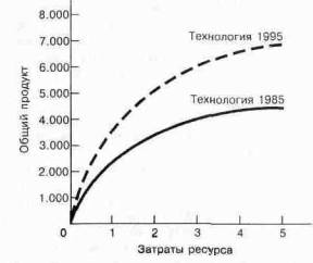 Сплошной линией представлены значения максимально доступных объемов выпуска для разных количеств ресурсов при уровне технологического развития 1985 г. В результате совершенствования технологий и методов управления кривая производственной функции перемещается вверх, что в данном случае соответствует увеличению выпуска в 1995 г. для каждого количества ресурсов на 50 процентов