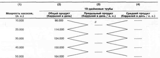 2. В нижеследующей таблице, описывающей производственную функцию нефтепроводов, заполните пустые ячейки предельного и среднего продуктов: