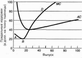 Но этот же рисунок проясняет важную взаимосвязь между МС и АС: Когда МС производства дополнительной единицы выпуска ниже А С, последние убывают. Когда МС выше АС, последние возрастают. В точке, где МС равны А С, кривая А С имеет нулевой наклон. Для типичной U-образной кривой А С точка, в которой МС равны АС, является также точкой минимума А С. Убедитесь в этом, внимательно рассмотрев график.