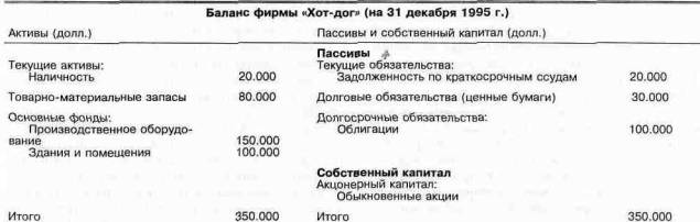 На стороне пассивов, задолженность по краткосрочным ссудам и долговые обязательства представляют собой средства, которые фирма задолжала за купленные товары или взяла в кредит. Облигации — это ценные бумаги долгосрочных займов, обращающиеся на рынке. Последняя статья баланса — чистая ценность, или собственный (акционерный) капитал. Это разность активов и пассивов фирмы, оцененных по первоначальной стоимости. В нашем примере собственный капитал должен быть равен 200.000 долл.
