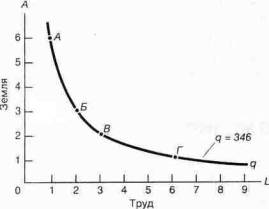 Проведем сглаженную кривую (по данным табл. 7А-1) через все точки, соответствующие q = 346. Эта кривая (рис. 7А-1) отражает различные комбинации количеств земли и труда, позволяющие произвести объем выпуска 346 единиц. Она называется кривой равных продуктов, или изоквантой, и аналогична кривой безразличия потребителя, рассмотренной в приложении к главе 5. Вы можете сами начертить на рис. 7А-1 по данным табл. 7А-1 изокванту, соответствующую объему выпуска 490 единиц. В самом деле, этих кривых бесконечное множество.