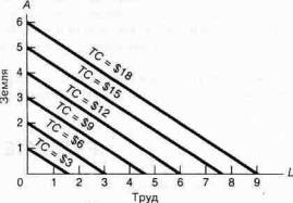 Простым способом поиска минимизирующего издержки метода производства является построение линий равных издержек (изокост). Это и проделано на рис. 7А-2, где несколько параллельных прямых являются линиями равных издержек при.цене труда 2 долл., а земли 3 долл.