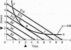 2. Какова минимизирующая издержки комбинация факторов, если производственная функция задана в табл. 7А-1, а факторные цены показаны на рис. 7А-3, где q = 346? Каково будет условие минимизации издержек при тех же факторных ценах, если объем выпуска удваивается (д = 692)? Что произойдет с «интенсивностью факторов» или отношением «земля-. труд»? Объясните, почему этот результат будет одним и тем же при любых изменениях объема выпуска, если отдача от масштаба постоянна.