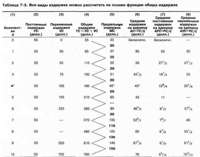 В табл. 7-1 приведены общие издержки (затраты) (ТС) для различных объемов выпуска q. Посмотрев на графы (1) и (2), можно заметить, что ТС возрастает по мере увеличения q. Это соответствует здравому смыслу, так как нужно затратить больше труда и других ресурсов, чтобы произвести большее количество товара;