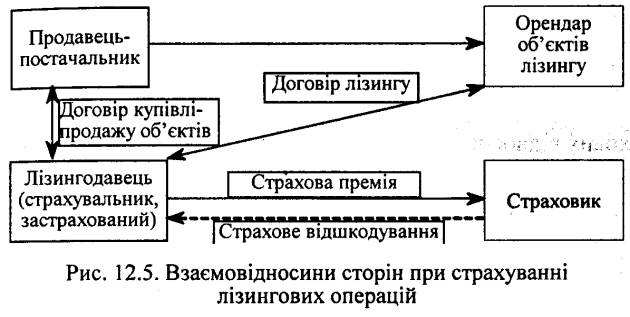 Важливим методом кредитування інвестиційної діяльності є надання лізингового кредиту. Таке кредитування може здійснюватися як безпосередньою переданням виробникам і власникам основних засобів у довгострокову оренду, так і за посередництвом спеціальних лізингових закладів. У вітчизняній господарській практиці роль лізингодавців-посередників можуть виконувати комерційні банки. Вони, застосовуючи фінансовий лізинг, мають змогу купувати основні засоби і передавати їх в оренду за відповідну плату. Як важливий елемент цієї плати передбачається ризикова надбавка, призначена на покриття збитків, які можуть виникнути в лізингодавця в разі несвоєчасного внесення орендної плати або ж неповернення об'єктів лізингу. Проте більшу ефективність у справі захисту інтересів лізингодавця може мати застосування страхування умов виконання лізингових операцій. Типова схема взаємовідносин між сторонами, які беруть участь у лізинговій операції та її страхуванні, набирає такого вигляду (рис. 12.5):