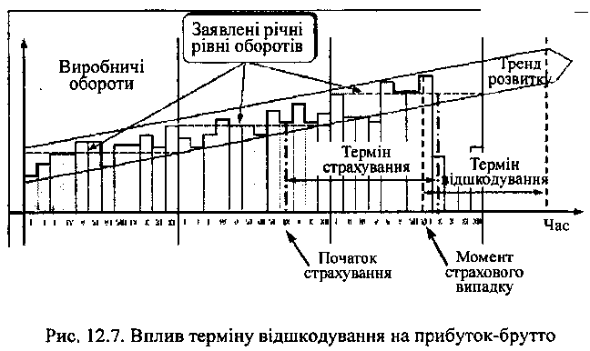 Страховик, як правило, погоджується на запропонований страхувальником термін відшкодування. Цей термін є періодом, лише в межах якого страховик несе відповідальність за втрату прибутку. Саме тому як страховик, так і страхувальник розуміють, що тривалість терміну відшкодування є найважливішим чинником впливу на страхову суму. Щоправда, у страховій практиці не додержують прямої залежності між установленим терміном відшкодування та обсягом страхової суми. У тих випадках, коли термін відшкодування береться коротшим за 12 місяців, страховики застосовують таблиці фракційного типу: для коротших термінів страхова сума встановлюється відносно вищою, ніж Для триваліших термінів. Найпоширенішим є термін відшкодування тривалістю від кількох місяців до одного року. Місце терміну відшкодування в розрахунках прибутку-брутто, який належить відшкодувати, можна показати схематично (рис. 12.7) (Jaroslaw A. Gniadek, Jacek Lisowski. Ubezpieczenia Majatkowe. - Poznan, 1996. -S. 109).