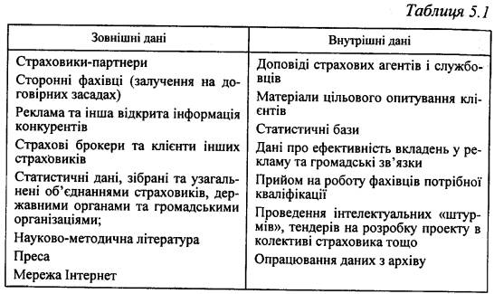 Основні джерела надходження чи отримання інформації для маркетингових досліджень у страхуванні наведено в табл. 5.1.