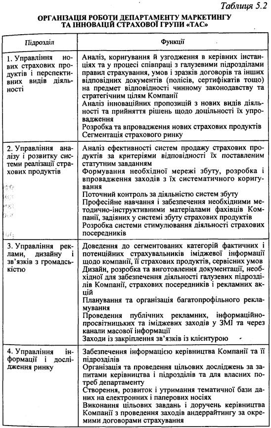 Для більшої наочності розглянемо приклад організації служби маркетингу в Страховій групі "ТАС". Функції окремих підрозділів Департаменту маркетингу та інновацій зображено в табл. 5.2.